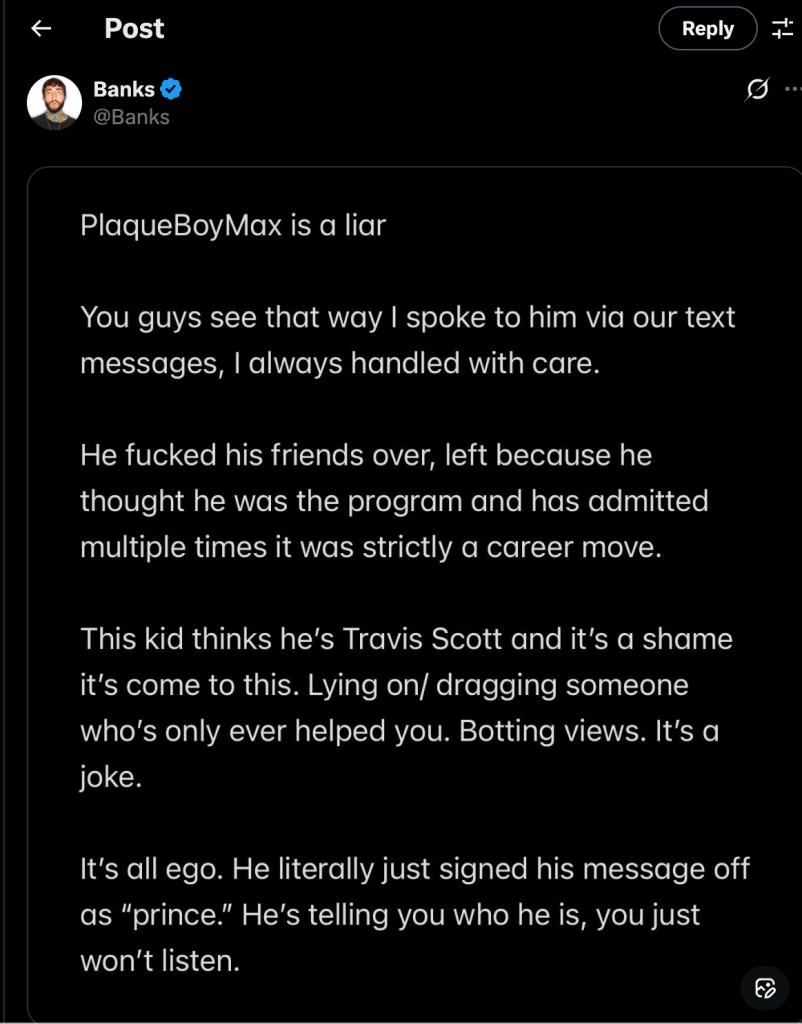 Banks’ claims were met with a rapid response from PlaqueBoyMax, who released screenshots allegedly showing controlling and manipulative messages from a FaZe member. Max denied all botting allegations and accused Banks of attempting to sabotage his reputation following his departure from the organization.