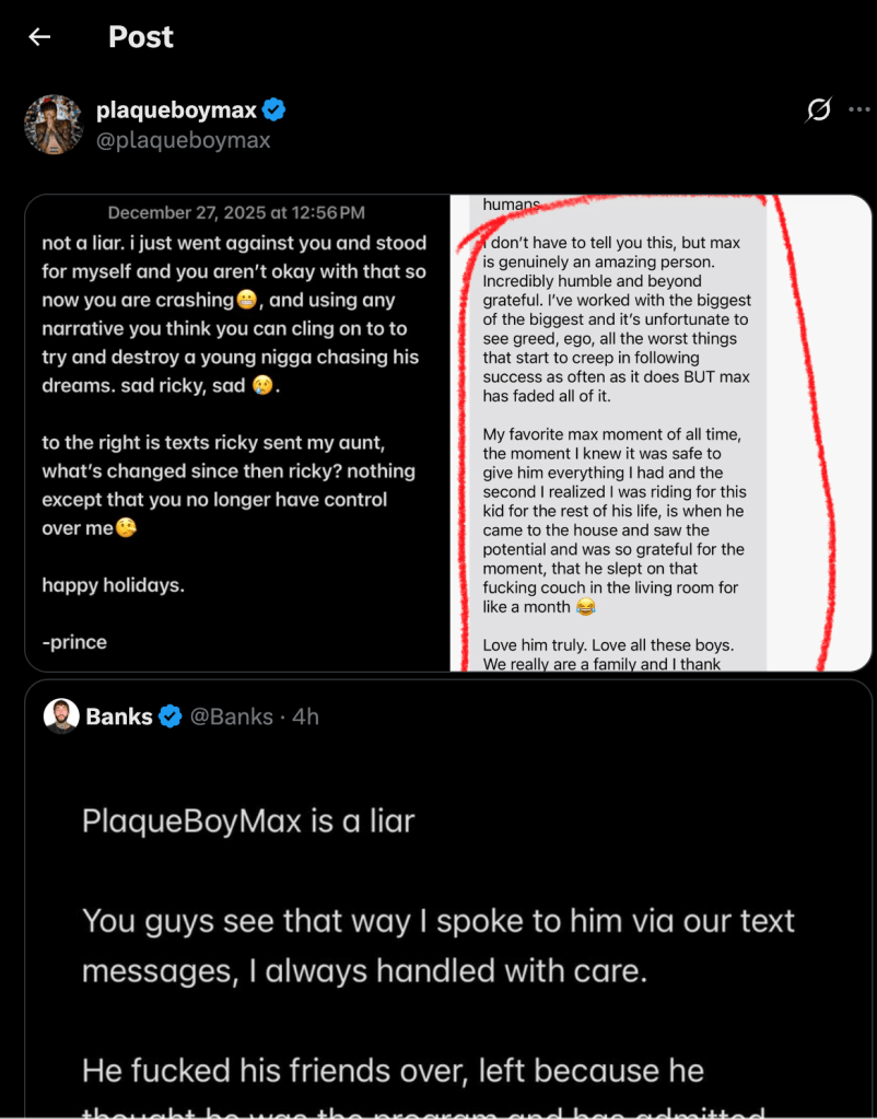 A major internal conflict within FaZe Clan has escalated after co-owner Richard “Banks” Bengtson publicly accused streamer Maxwell “PlaqueBoyMax” Dent of botting Twitch views, distancing himself from FaZe affiliates, and signing messages with the title “-prince.”